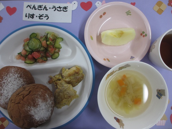 黒糖ロール タンドリーチキン 野菜サラダ スープ フルーツ