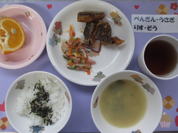 軟飯 白身魚の煮つけ 人参の甘煮 味噌汁 フルーツ