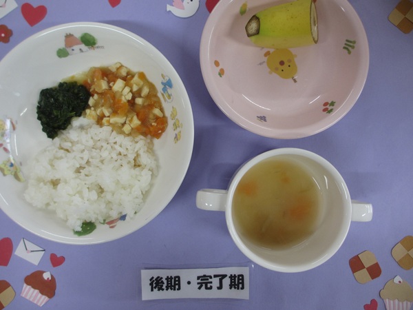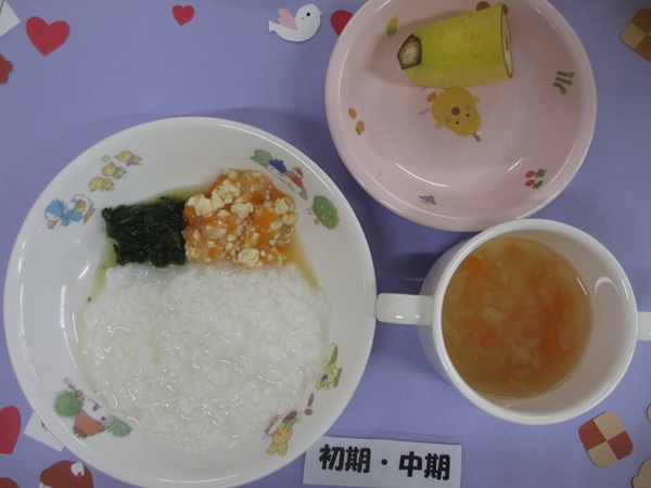 2/27(金)おかゆ 豆腐野菜煮 ほうれん草のやわらか煮 スープ フルーツ