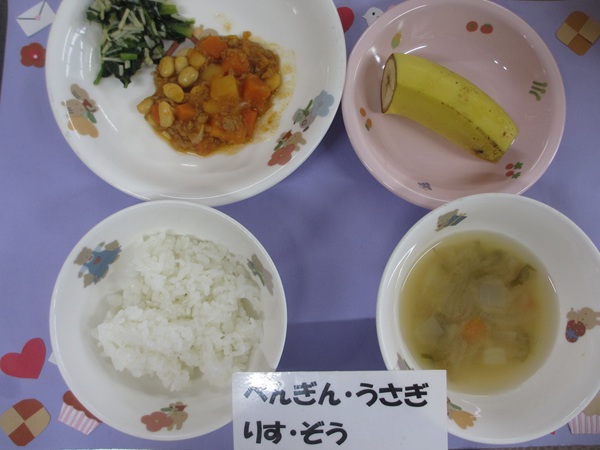 米飯 チリコンカン ほうれん草とえのきのナムル 味噌汁 フルーツ