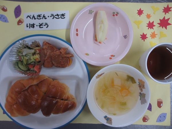 9/8(月)ジャムバターロール 鶏肉のバーベキューソース フレンチサラダ スープ フレンチサラダ