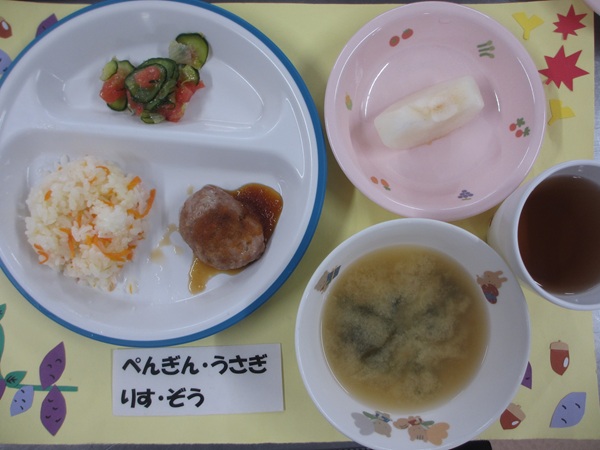 9/10(水)人参ご飯 和風ハンバーグ 野菜サラダ 味噌汁 フルーツ