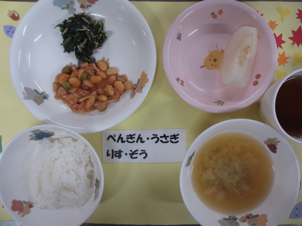 9/12(金)米飯 ポークビーンズ ほうれん草とえのきのナムル 味噌汁 フルーツ