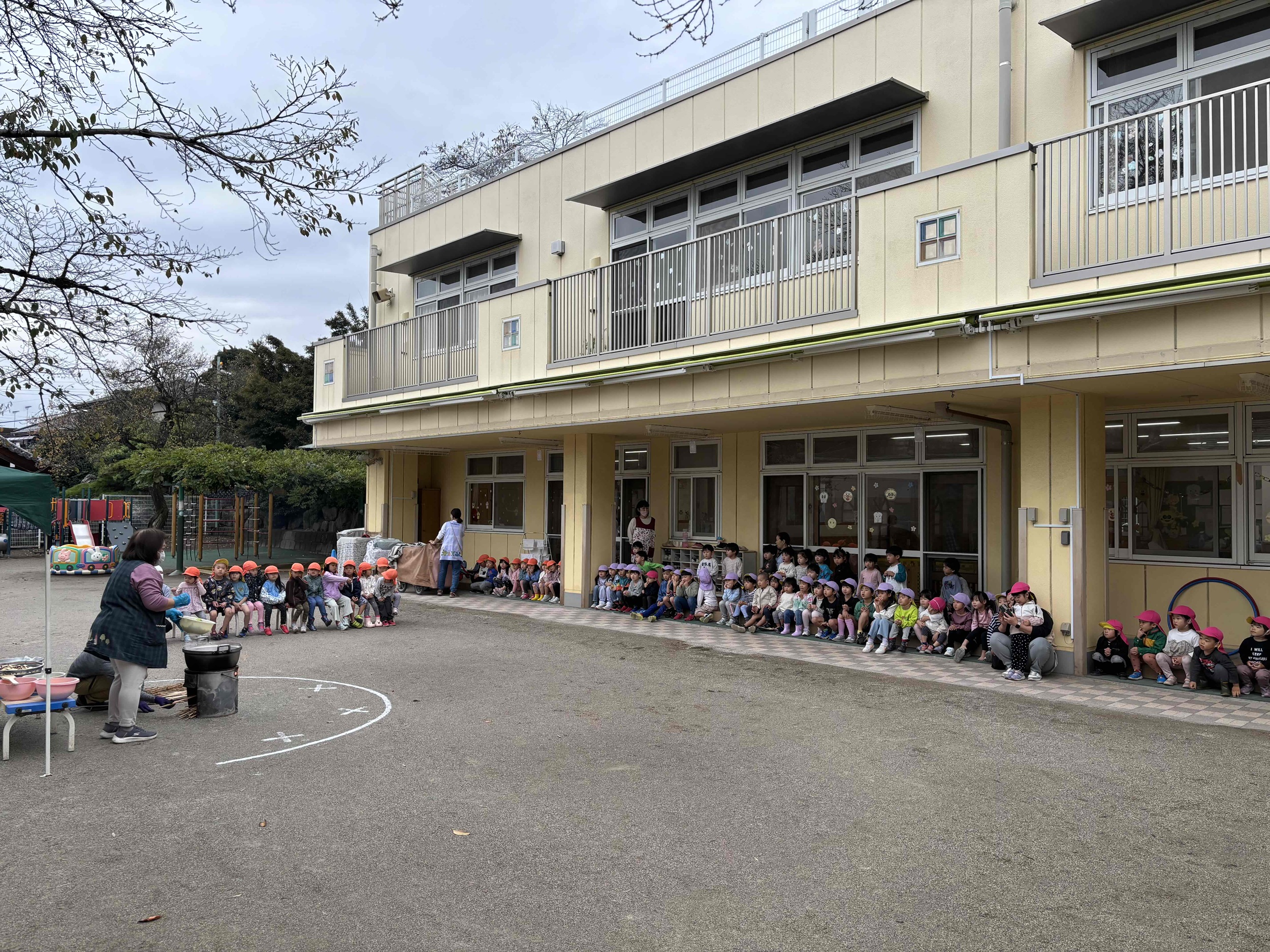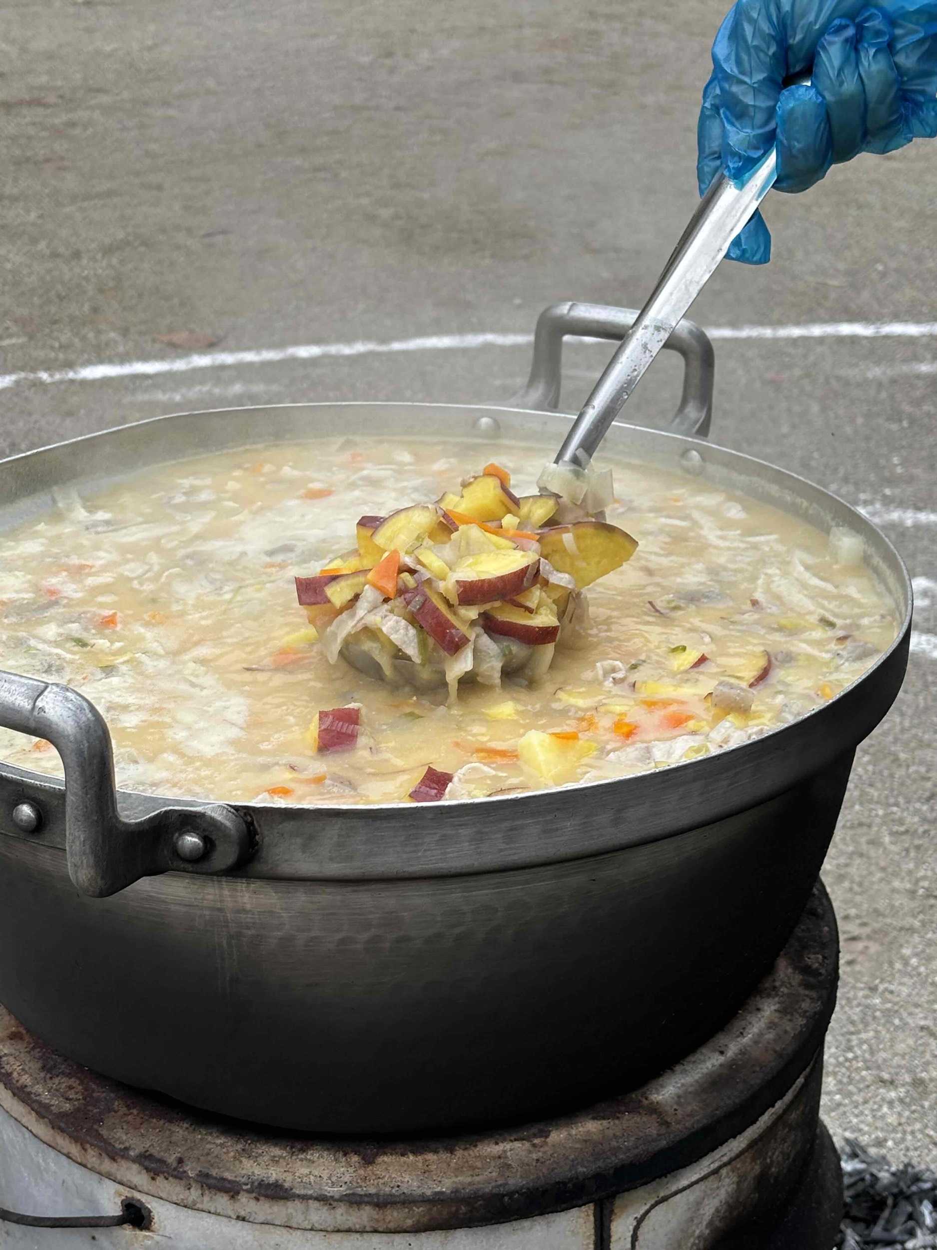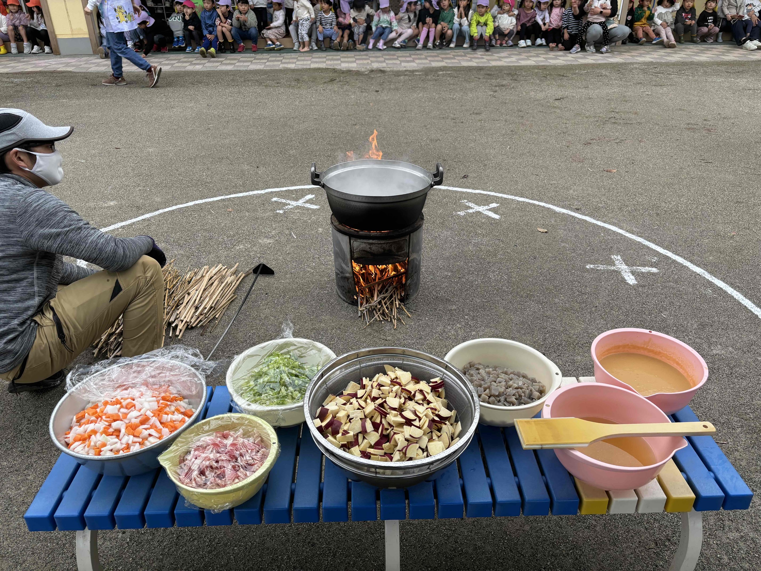 寒空の中でしたが、ぐつぐつと沸いたお湯の中に、みんなが手伝ってくれた具材を入れるたびに「お~」と歓声がわき、