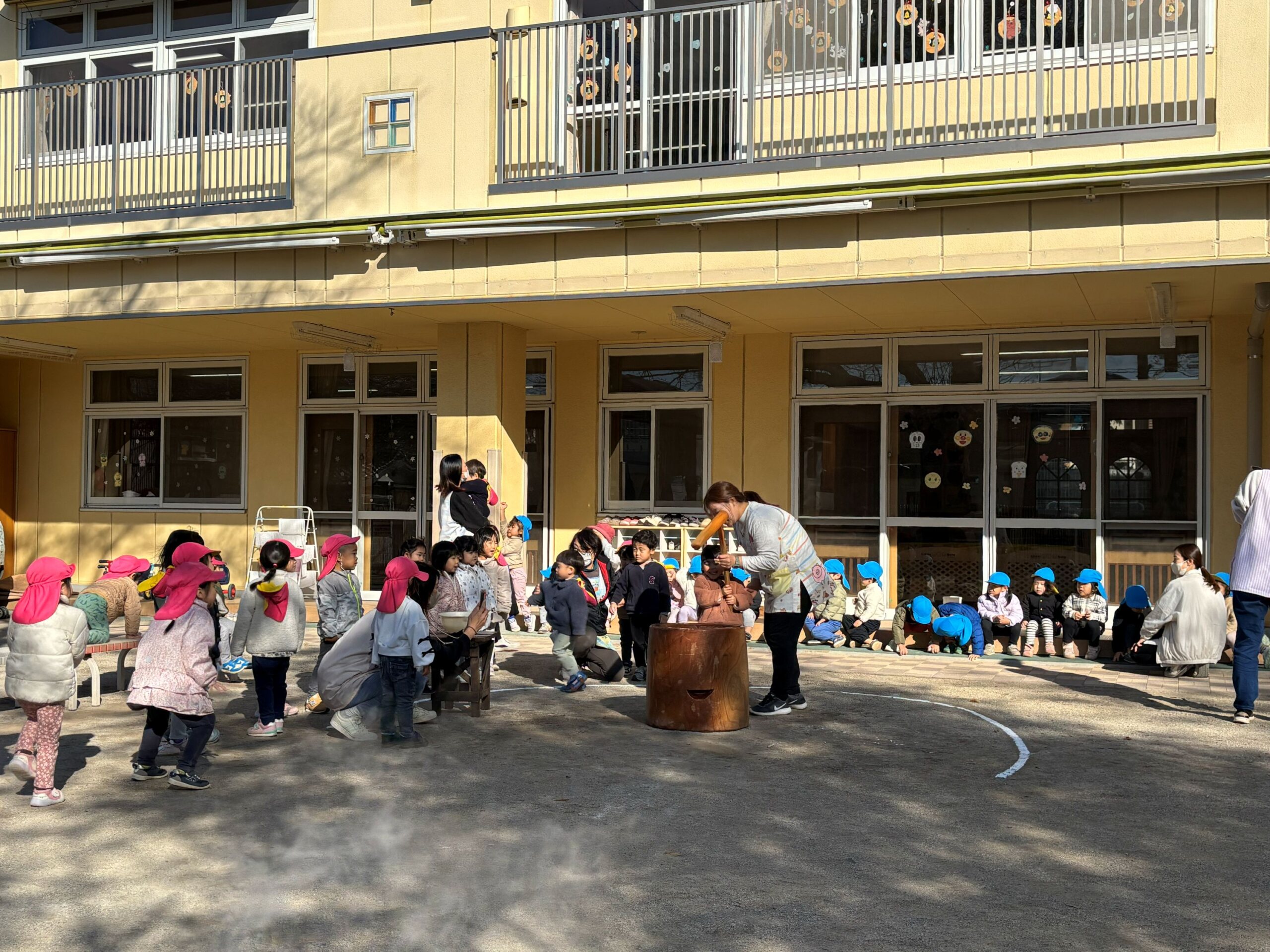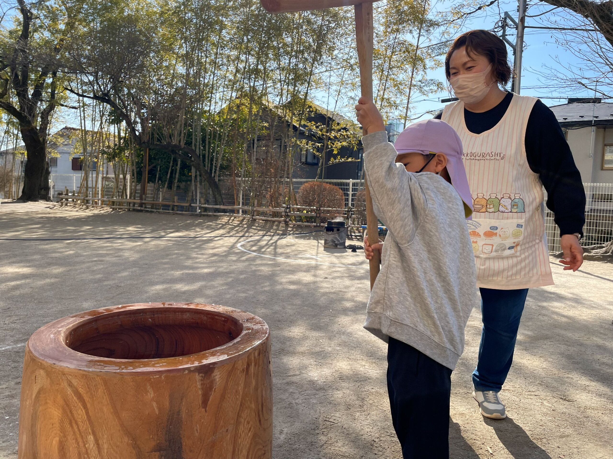 誠和保育園では、せいろでもち米を蒸して餅つきをします。