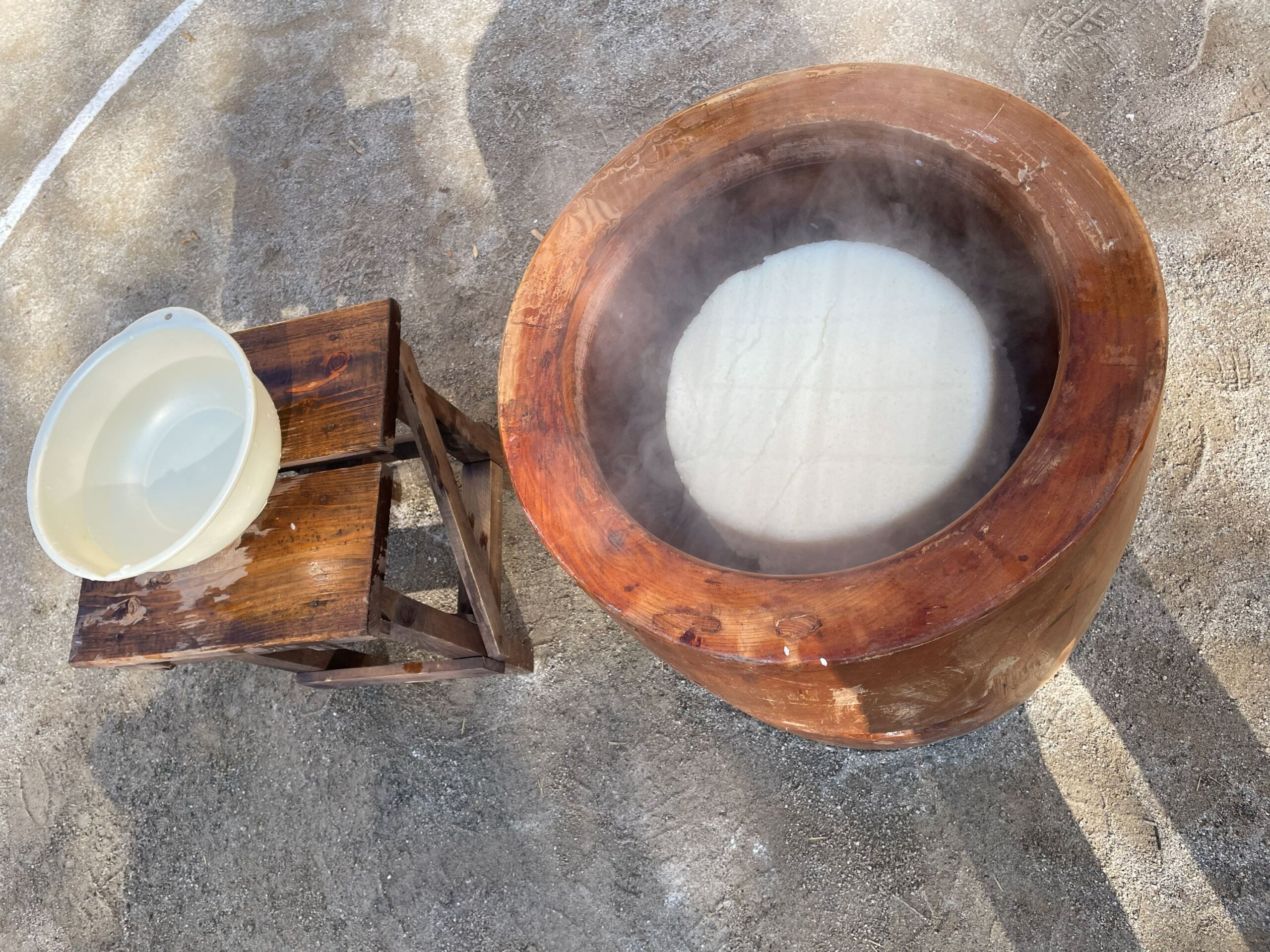炊いたお米を、一生懸命おっこねて、おっこねて。