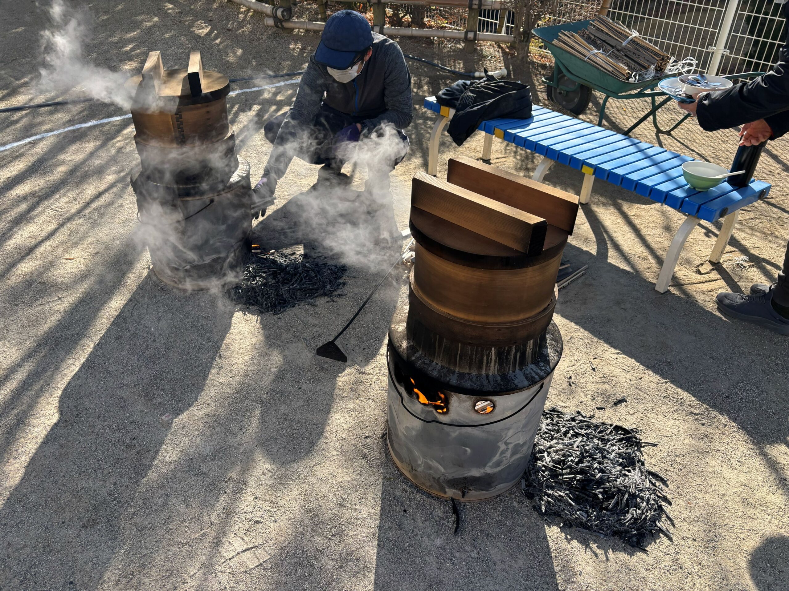 もくもくの煙に、登園してきた子ども達から「何してるの~?」と聞かれました。