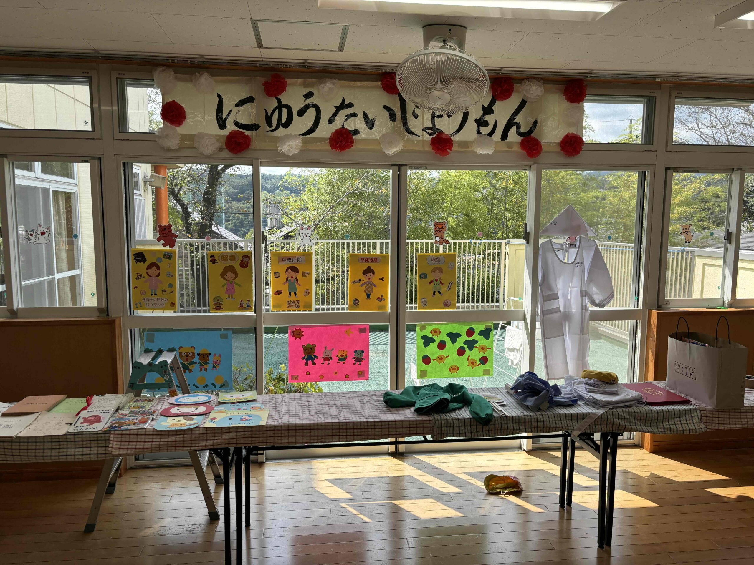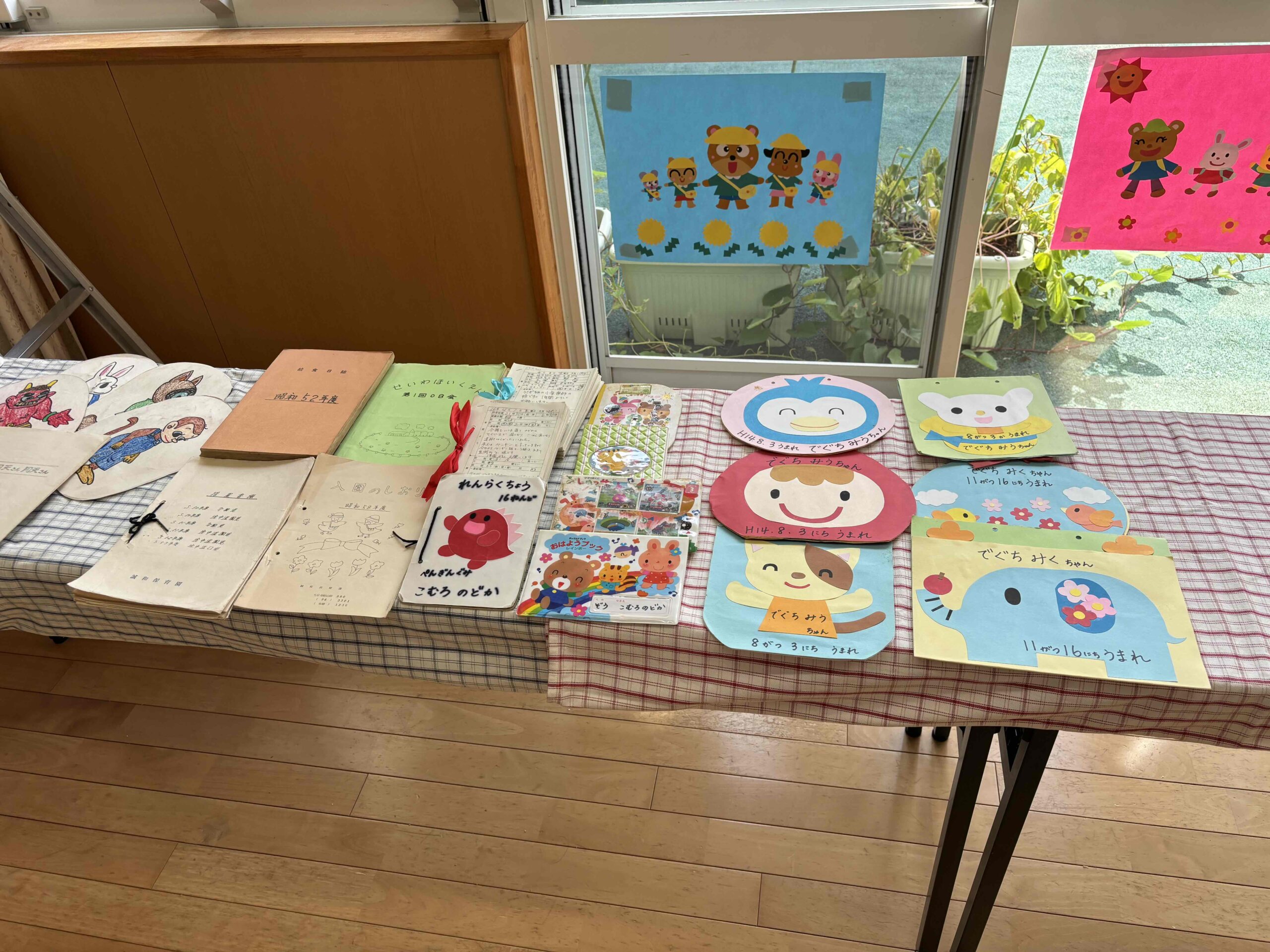 初代園長の書いた運動会の「にゅうたいじょうもん」の看板や、昔の連絡帳・シールノート・誕生日カードなど、「よく取っておいたね~」と驚くものもありました。