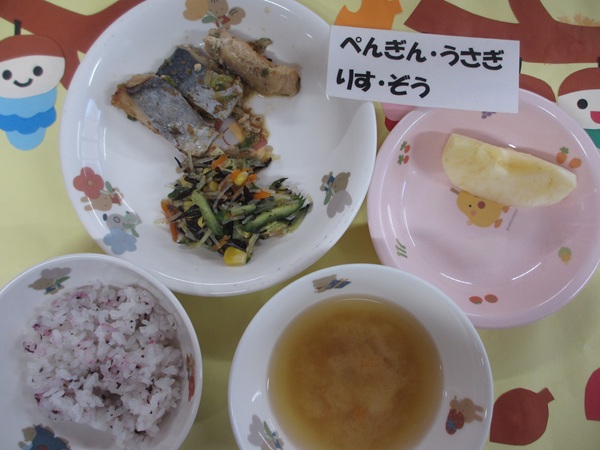 11/12(水)軟飯 白身さかなの煮つけ ひじきサラダ 味噌汁 フルーツ