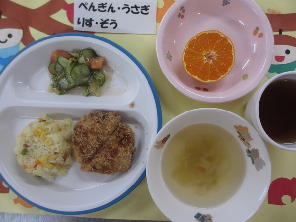 カレーピラフ キャベツメンチ 野菜サラダ スープ フルーツ