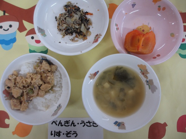11/13(木)軟飯 挽肉の野菜煮 野菜サラダ スープ フルーツ