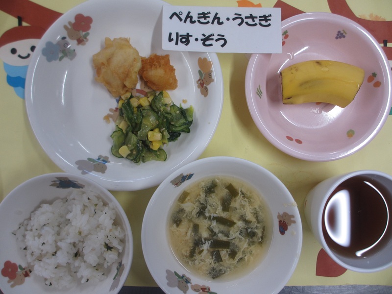 いりこ菜飯 白身魚のカレー天ぷら みそドレサラダ 味噌汁 フルーツ