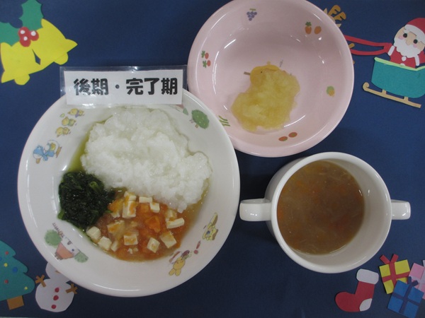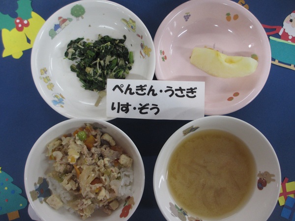12/5(金)軟飯 豆腐の味噌野菜煮 ほうれん草のお浸し 味噌汁 りんご