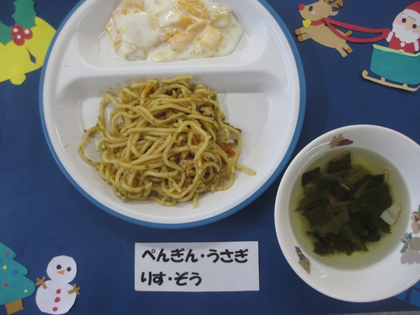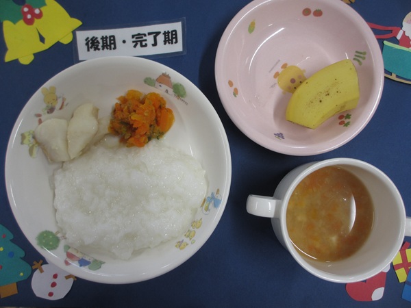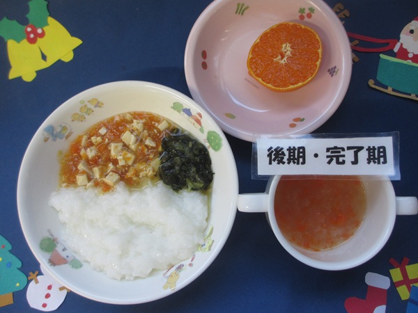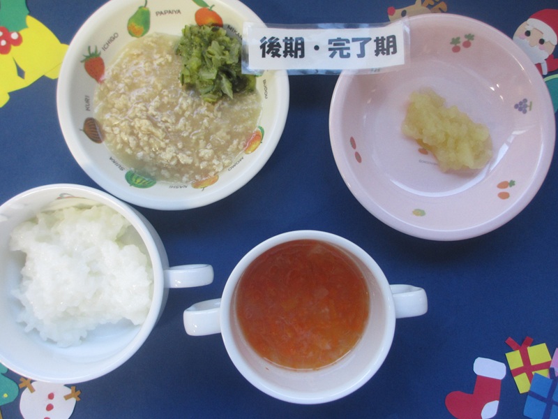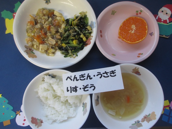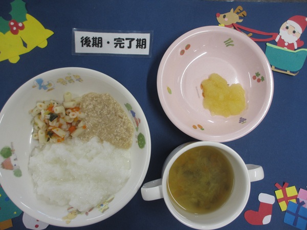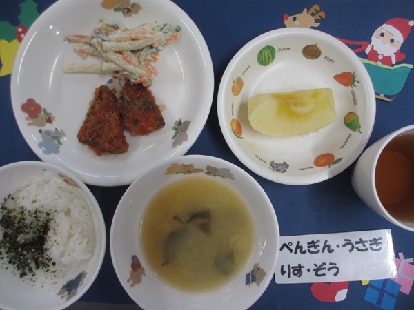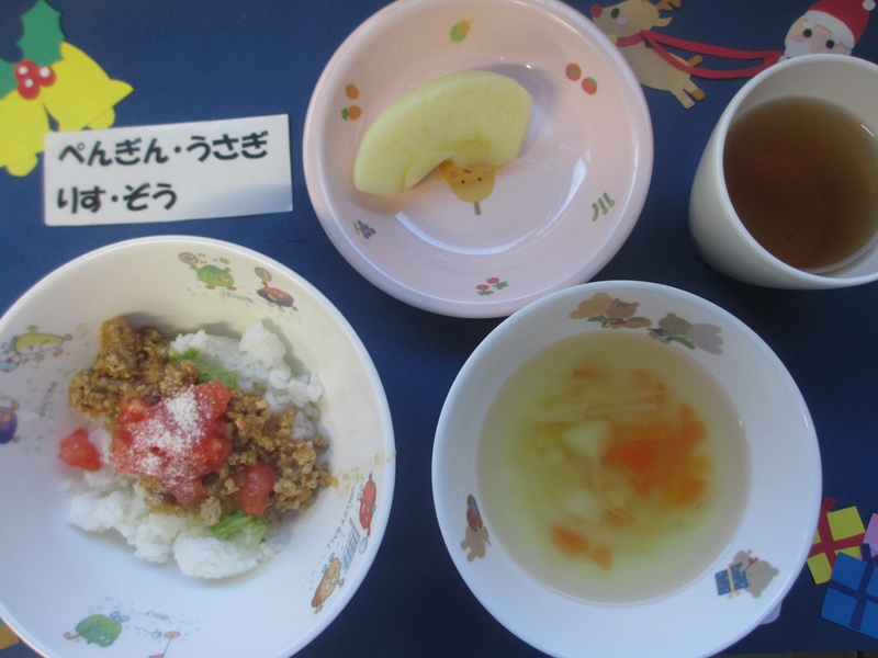 12/15(月)軟飯 挽肉煮 野菜サラダ スープ りんご