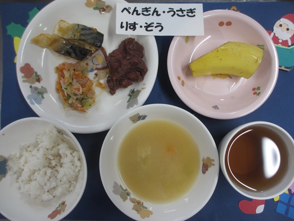 12/19(金)軟飯 白身魚の味噌煮 きゅうりサラダ 味噌汁 バナナ