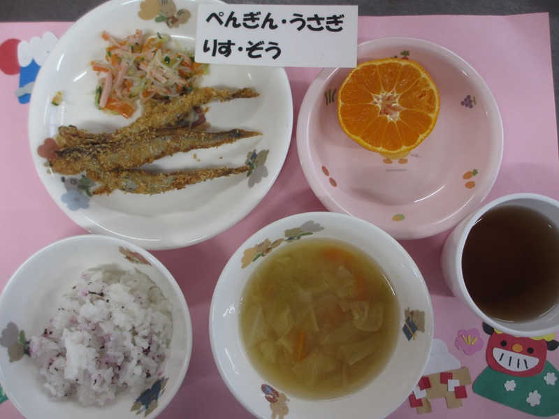 ゆかりご飯 ししゃもフライ 春雨の酢の物 味噌汁 フルーツ