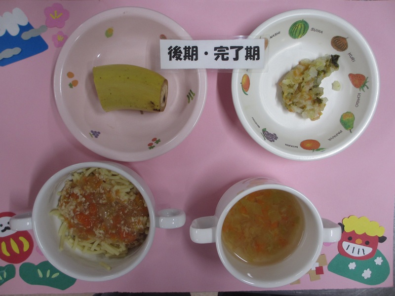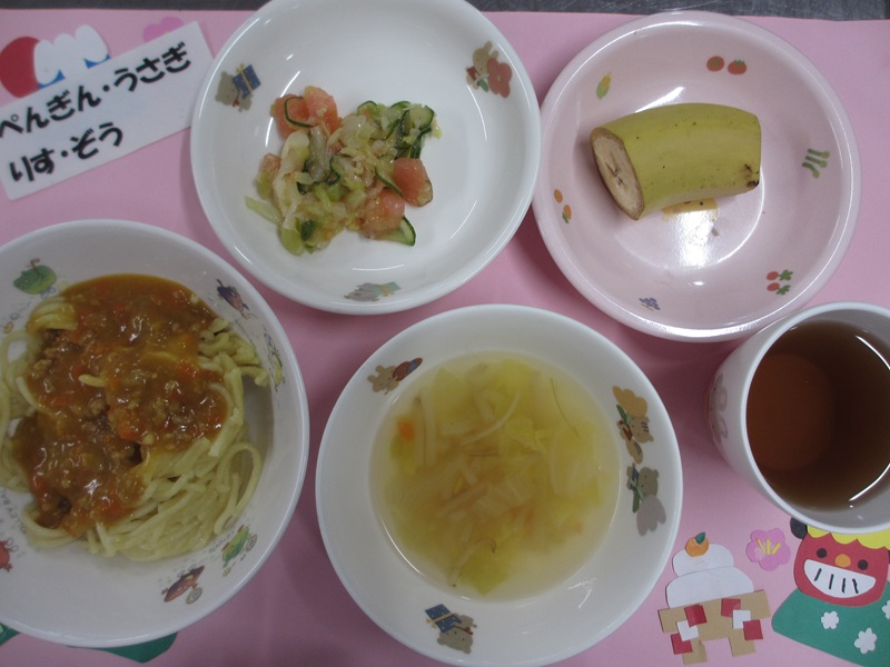 やわらかスパゲティ 野菜サラダ スープ フルーツ
