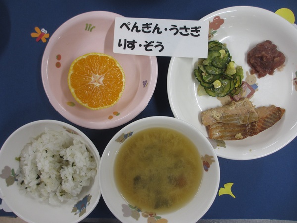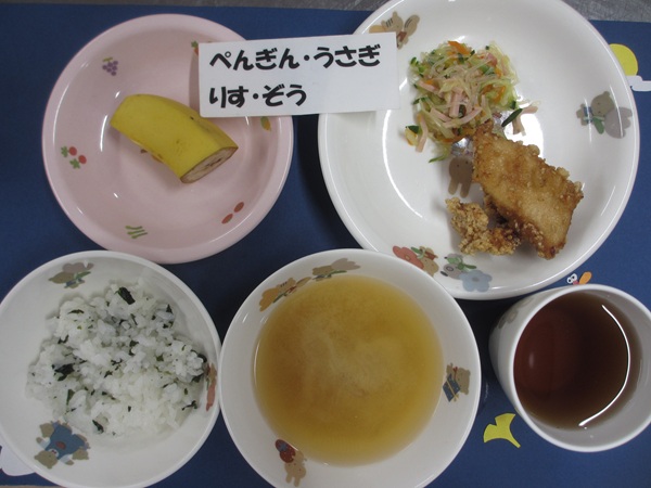 わかめご飯 鶏肉の香り揚げ 中華風酢の物 味噌汁 フルーツ
