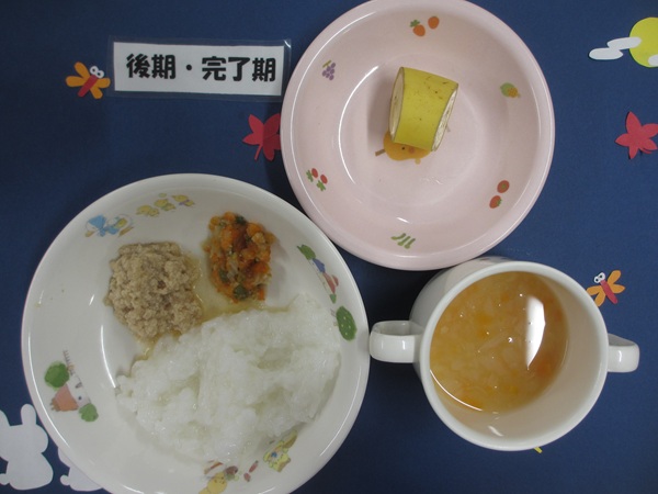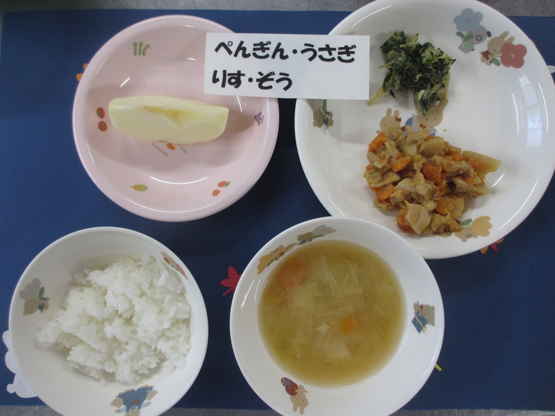 10/3(金)軟飯 挽肉煮 キャベツサラダ 味噌汁 フルーツ