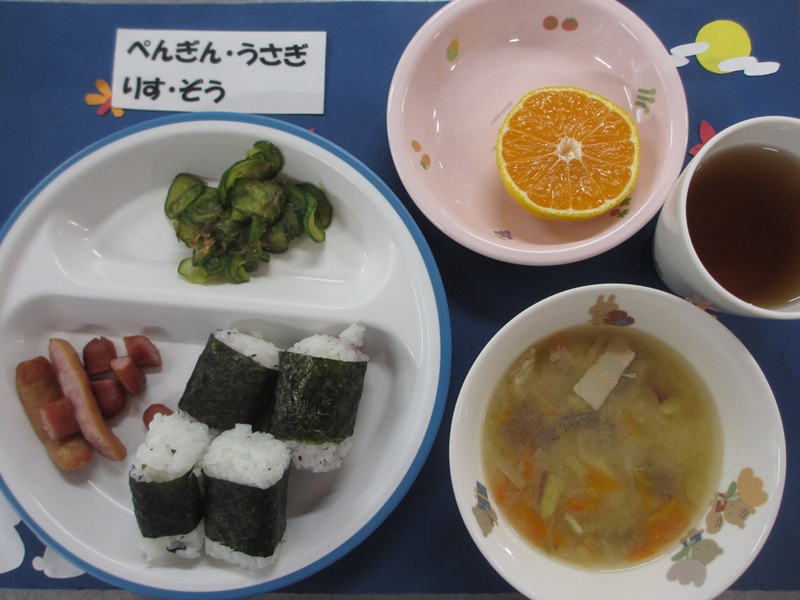 二色おにぎり ウィンナー きゅうりのかか和え 芋煮汁 フルーツ