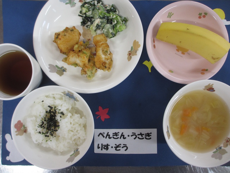 ふりかけご飯 白身魚の錦揚げ キャベツの味噌マヨ和え 味噌汁 フルーツ