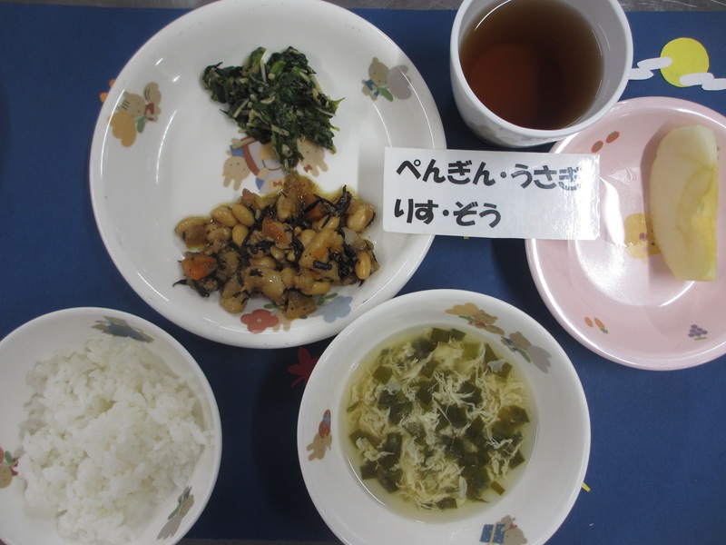米飯 大豆の五目煮 ほうれん草とえのきのナムル 味噌汁 フルーツ