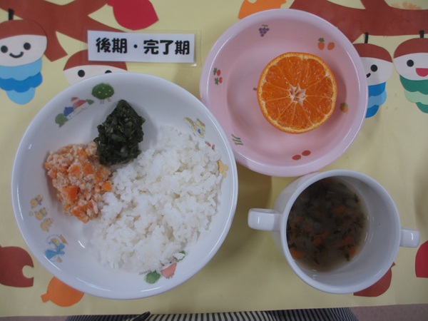 11/4(火)軟飯 挽肉煮 ほうれん草のお浸し 味噌汁 フルーツ
