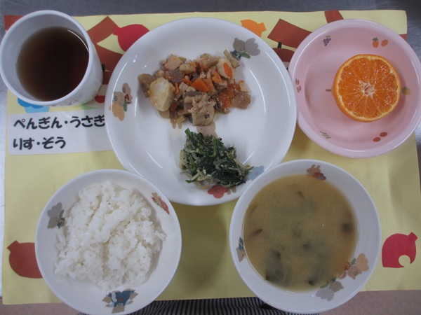 米飯 筑前煮 ほうれん草ともやしのナムル 味噌汁 フルーツ