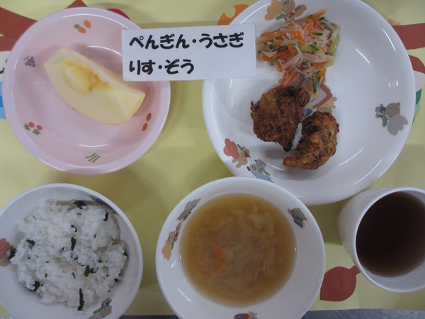 わかめご飯 岩石揚げ 春雨の酢の物 味噌汁 フルーツ