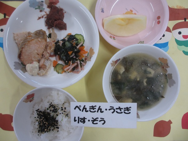 11/7(金)軟飯 白身魚の煮つけ わかめサラダ 味噌汁 フルーツ